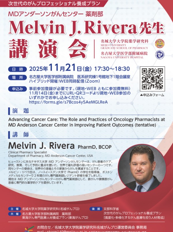 令和7年11月21日(金)、東海がんプロと共催して名古屋大学医学部附属病院 医系研究棟1号館地下1階会議室にて、MDアンダーソンがんセンター薬剤部 Melvin J. Rivera先生の講演会をハイブリッドで開催しました。